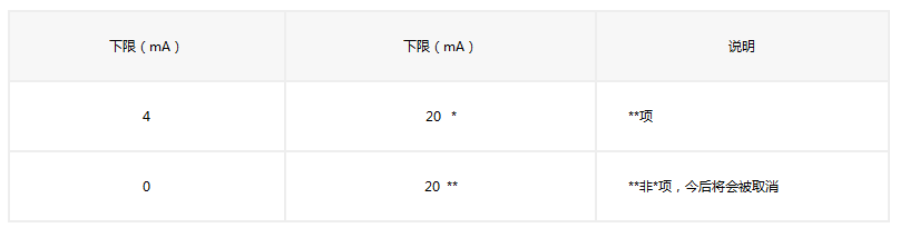GB/T 3369.1-2008《過程控制系統(tǒng)用模擬信號(hào)第1部分:直流電流信號(hào)》中模擬直流電流信號(hào)(負(fù)載電阻為0-300Ω)的規(guī)定見表1表1模擬直流電流信號(hào)