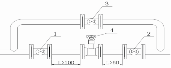 不允許直接在流量計(jì)測量管前后端安裝閥門、彎頭等極大改變流體流態(tài)的部件,如果需要在流量計(jì)前后管道上安裝閥門、彎頭等部件也應(yīng)盡量保證前后直管段長度,直管段要求前10D,后5D,對于新完工的工藝管道,應(yīng)先進(jìn)行初步吹掃后再安裝流量計(jì)。