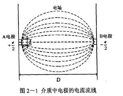 對于點(diǎn)電極的電磁流量計流量信號內(nèi)阻來說,如圖2-1所示,在絕緣襯里的傳感器測量管內(nèi)壁,裝有一對接液電極.電極是圓盤狀,直徑為d,電極A和電極B的距離(測量管直徑)為D(d<<D)。充滿導(dǎo)電液體的管道足夠長,電極所處介質(zhì)的電導(dǎo)率s和介電常數(shù)e是均質(zhì)的,對介質(zhì)內(nèi)的電流場不致有所改變。在這些假定條件下,電極實(shí)際上等于埋在各個方向具有無限深層的介質(zhì)內(nèi)。設(shè)兩電極間的電動勢為e,A電極的電位為+e/2,B電極的電位為-e/2。從圖2-1可以看出,電流由A電極向介質(zhì)散流匯集于B電極流出。電流流動時流過的截面在電極附近最小,以后離電極愈遠(yuǎn)愈大。也就是說離電極愈遠(yuǎn)電流密度愈小,因而電場強(qiáng)度也愈小。由此可見,在電流經(jīng)過的途徑每單位長度上,介質(zhì)對電流的電阻愈遠(yuǎn)愈?。@樣,在計算傳感器信號內(nèi)阻時,可以暫把流體的體電阻視為零,僅計算兩電極與介質(zhì)相接觸的接觸電阻。