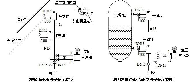 2、測量液體流量時(shí),差壓變送器應(yīng)安裝在被測管道的旁邊或下面,以便氣泡排入管道中;或上面,以便積聚的液體容易流入管道中;下面,以便冷凝水能充滿在引壓管中。