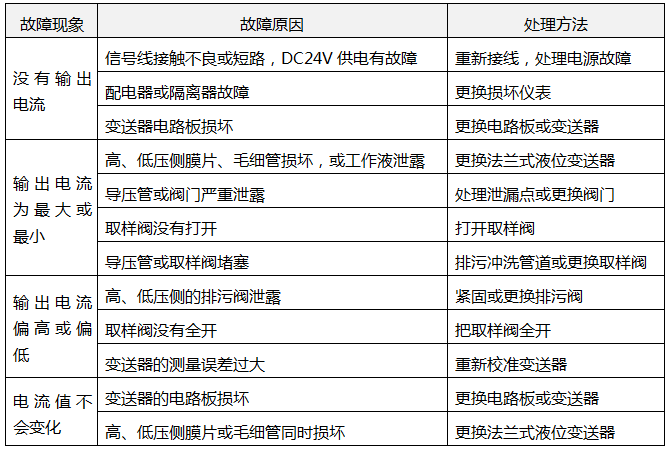 如果液位測量中顯示出現(xiàn)異常,應(yīng)先確定是工藝液位異常還是測量系統(tǒng)問題。如確認(rèn)是測量系統(tǒng)問題,則應(yīng)根據(jù)故障現(xiàn)象來分析故障原因。差壓式液位變送器常見故障及處理方法見表1